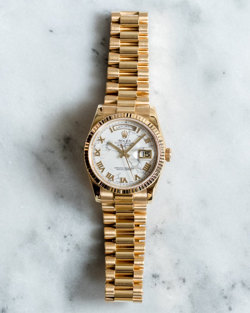 Rolex president day date 118238 champagne dial 18k yellow gold... Rolex president day date 118238 champagne dial 18k yellow gold. Rolex day date 18238 president diamond dial men's watch box &. Marble's reputation of being luxurious and classy, and having been used in history by powerful leaders to build temples makes this a perfect stone type for a rolex dial.. Making a dial from marble, however, is quite difficult due to the delicate nature of the material.