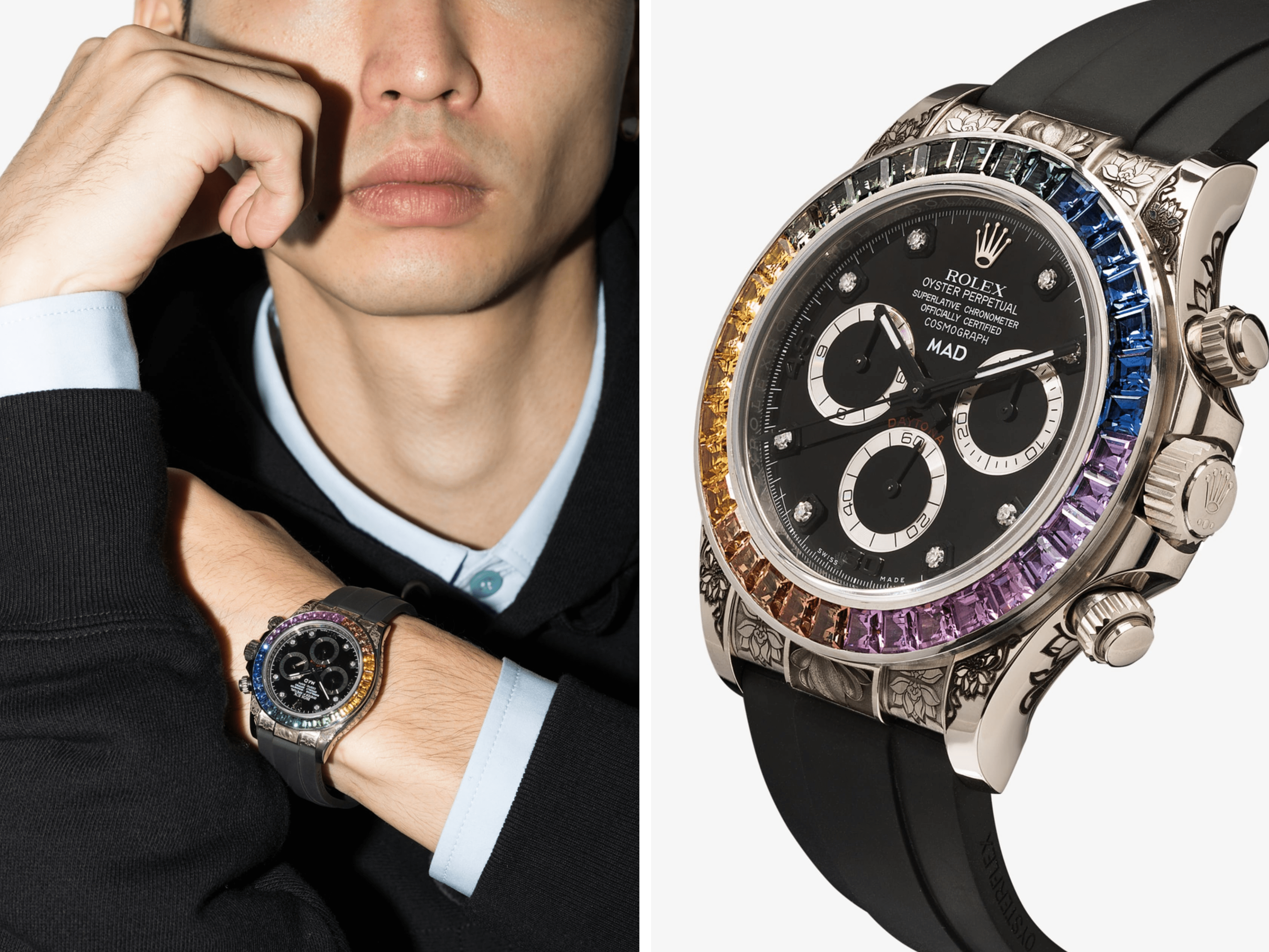 Das ziffernblatt und die lunette sind beiden nachträchlich / aftermarket gesetzt mit edelsteine und brillanten. Die abgebildete rolex cosmograph daytona komt mit box, papieren und 1 jahr juwelier burger garantie. Das ziffernblatt und die lunette sind beiden nachträchlich / aftermarket gesetzt mit edelsteine und brillanten. Rolex daytona rose gold rainbow baguette & dial 116595rbow. Rolex daytona 116505 modified 116595rbow. Auch kevin hart ist stolzer besitzer einer rainbow daytona (er hat sogar mehrere daytonas), sowie post malone und adam levine (der auch eine „paul newman" daytona besitzt)... Replica, rolex, daytona, fake, rainbow.